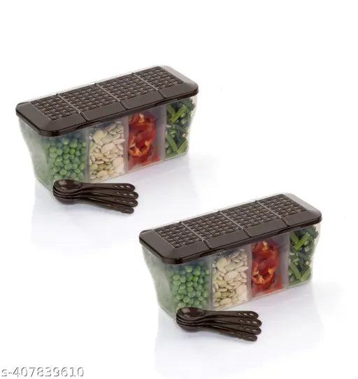 4 in 1 Multipurpose 4 Section Kitchen, Fridge Storage Airtight Container Set for Vegetables, Dryfruits, Spices, Groceries, and Pickles with 4 Spoons Storage Set (Brown, Pack of 2)